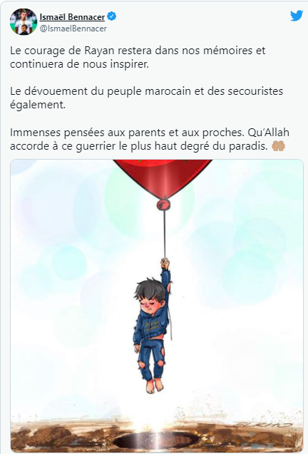 C’est avec une immense tristesse que je viens d’apprendre le décès de Rayan. Toutes mes sincères condoléances à la famille et aux proches. Pensée au peuple marocain pour leurs efforts multiples et la solidarité sans relâche. Repose en Paix petit ange