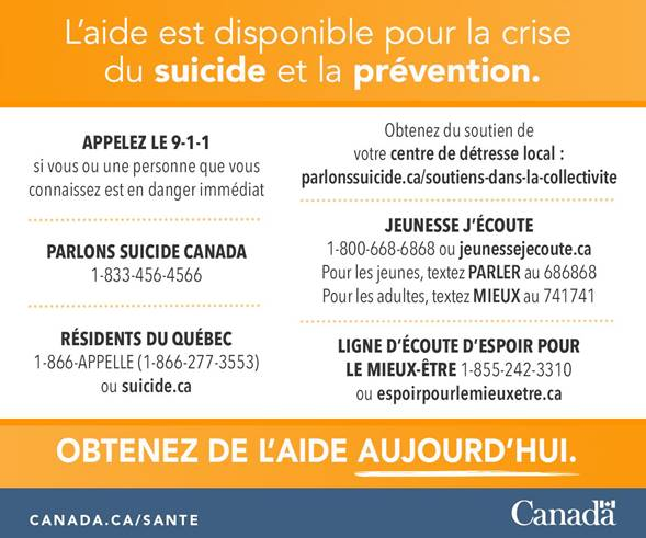 · Jeunesse J’écoute (1-800-668-6868) – Pour les jeunes, textez PARLER au 686868 – Pour les adultes, textez MIEUX au 741741