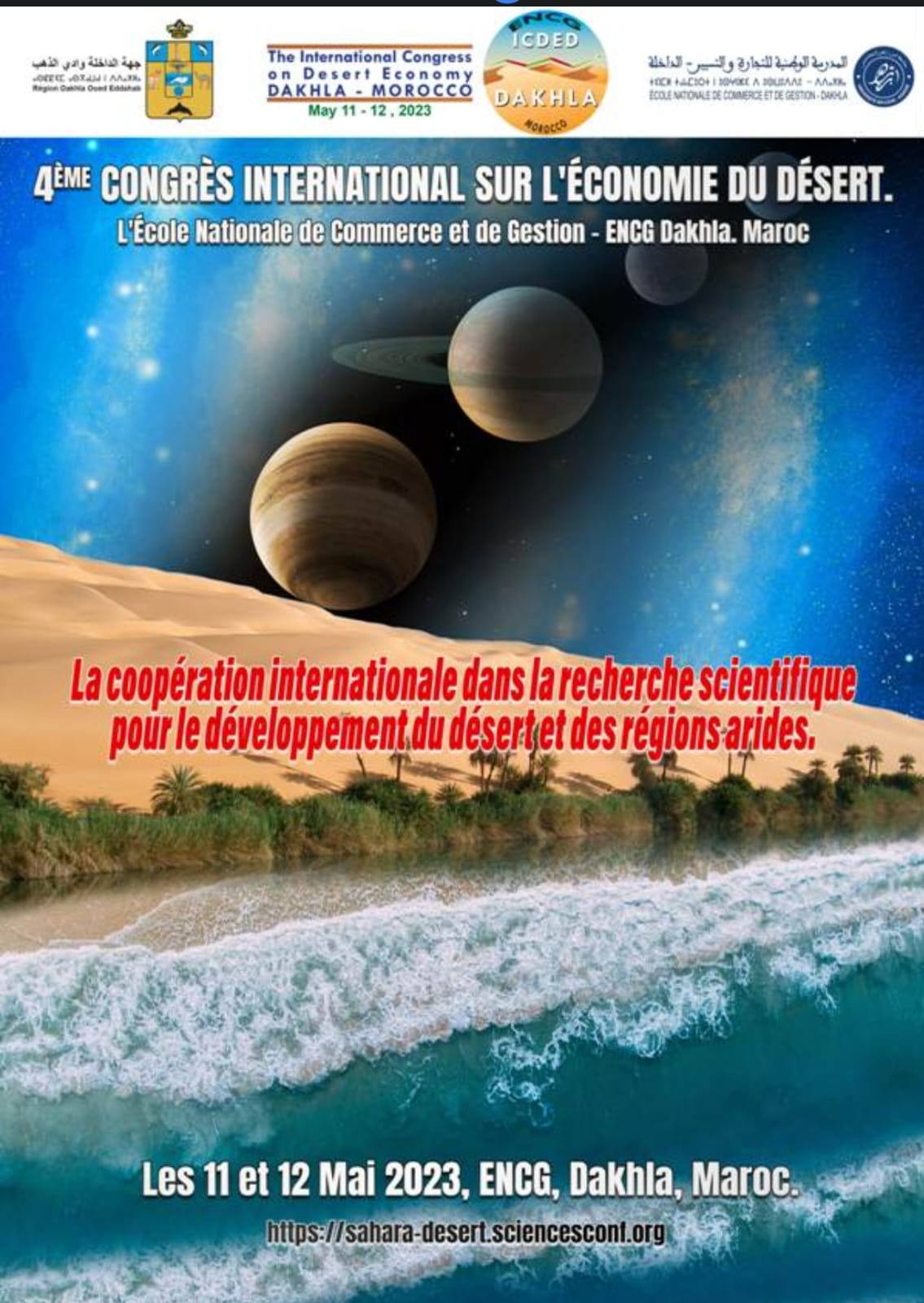 The International Congress on Desert Economy – ENCG, Dakhla, Morocco (ICDED), This fourth edition will be held on May 11 and 12, 2023, in the Dakhla city, Morocco and the first worldwide scientific research meeting on arid lands, the Sahara, and desert economic